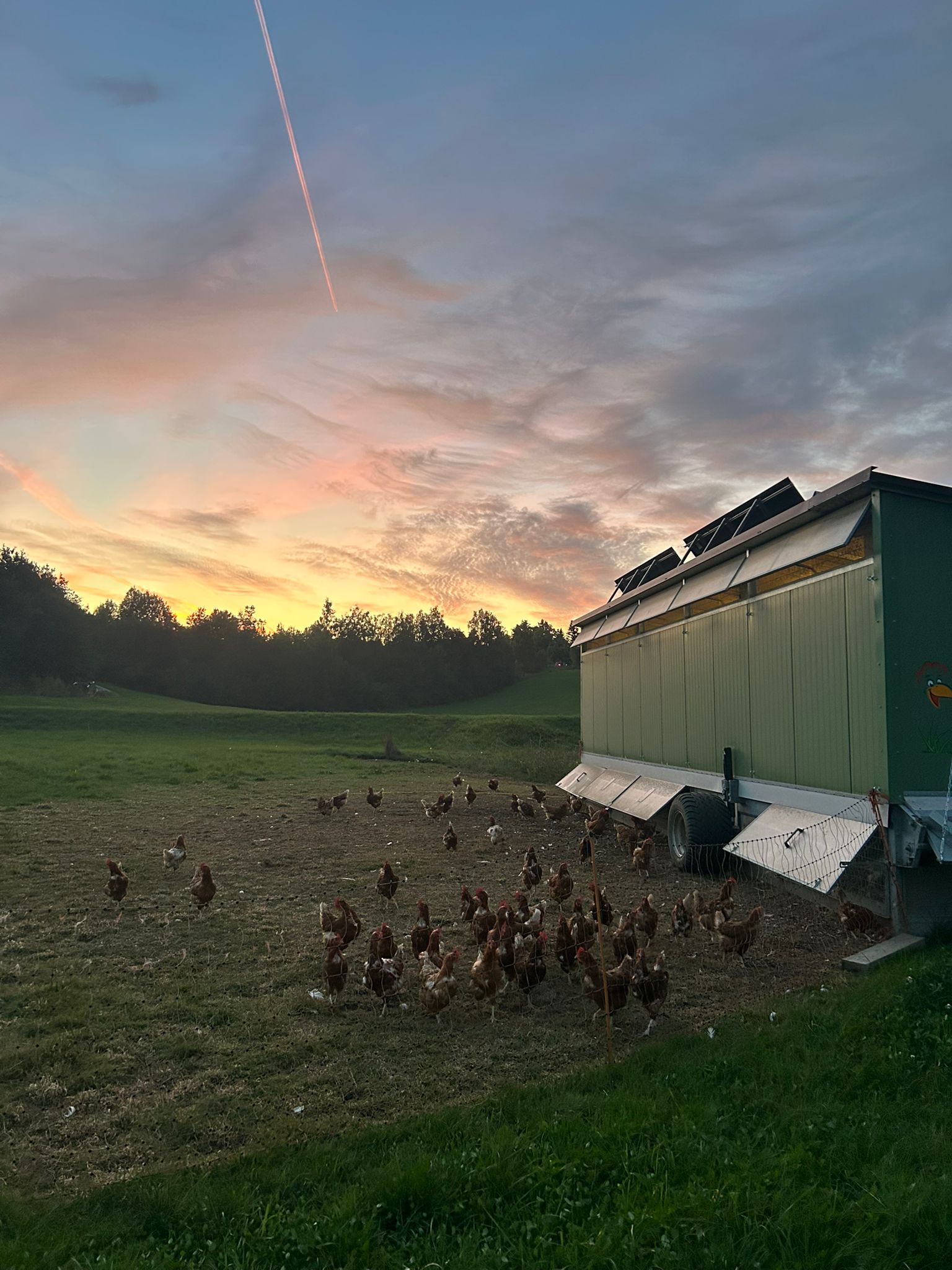 Für die Nacht ziehen sie in unsere Mobilställe ein. Diese stehen nicht immer am selben Fleck, sondern werden regelmäßig versetzt, damit die Hühner immer frische Böden unter den Füßen haben und die Wiesen sich erholen können. Unsere Haltung ist besonders schonend für die Tiere und den Boden und sorgt dafür, dass die Hühner jeden Tag beste Bedingungen vorfinden.